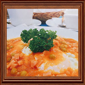 Huevos revueltos, con butifarras, tortillas en juliana y servidos con salsa