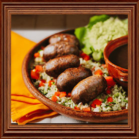 Longaniza, butifarras, chorizo, quesadillas con cochinita, tostones, frijoles refritos y guacamole.